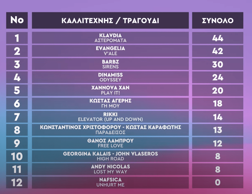A combination of a Greek and an international jury (50%) and the Greek televote (50%) have decided that Klavdia with the song “Asteromáta” is the winner and will therefore perform for Greece in Basel.